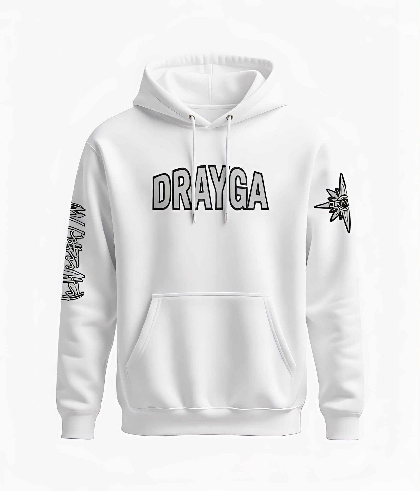 The Drayga Star Trooper White Hooded Pullover comes in a crisp, all-white base that feels sharp, elevated, and effortlessly bold. Front and center, the outlined DRAYGA lettering delivers a clean, confident presence — strong without being loud. It’s minimal, but it hits. The sleeves bring the attitude. One arm features a sharp Star Trooper emblem — detailed, futuristic, and unmistakably DRAYGA. The other sleeve carries stylized graphic lettering that adds that raw street-art edge, giving the hoodie movement and personality from every angle.